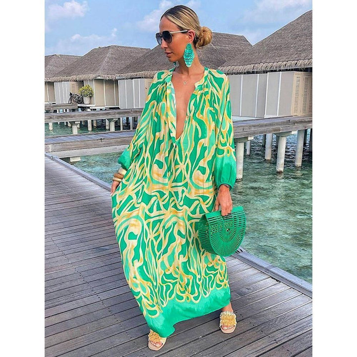Women Boho Print Beach Cover Up 2023 Summer Sexy Deep V-Neck Long Sleeve Long Dresses Female Vintage Maxi Dresses Elegant Robe 186.61