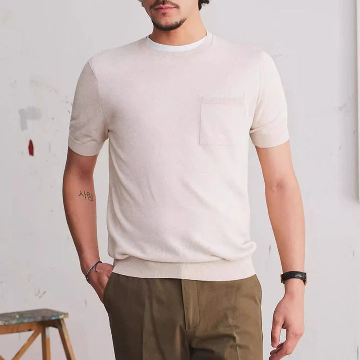 Sold out Stylish Pockets Knit T-shirts Mens Casual Solid Color Slim Fit Knitting Jumper Men Tops Summer Vintage O Neck Short Sleeve Tees 73.46