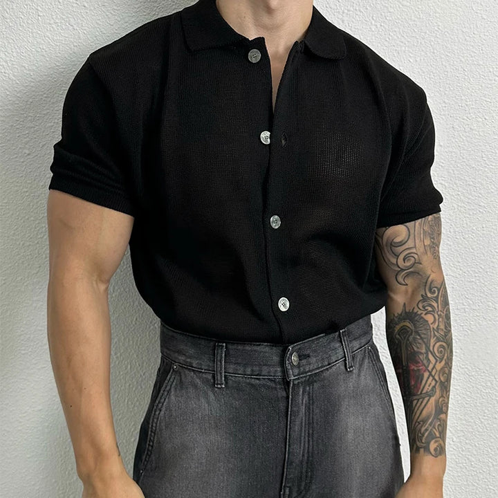 2024 Summer Mens Casual Tops Knitted Turn-down Collar Button Short Sleeve Slim Shirt For Men Knitwear Vintage Solid Color Shirts 163.59