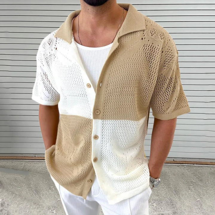 Vintage Contrast Color Hollow Out Knit Shirt Men Summer Casual Short Sleeve Button-up Lapel Knitted Mens Shirts Fashion Cardigan 236.10