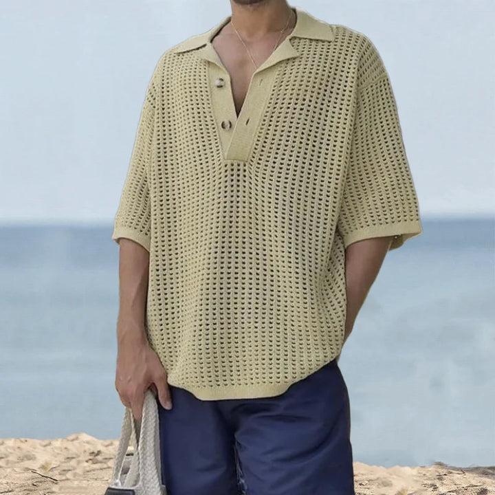 Fashion Mesh Hollow Out Knitted Polo Shirts Men Spring Summer Casual Solid Color Buttoned Lapel Tops For Mens Vintage Knit Tees 128.92