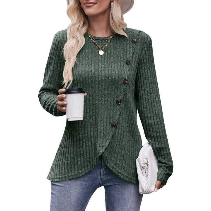 Women's Round-neck Sunken Stripe Brushed Tulip Hem Solid Color Button T-shirt