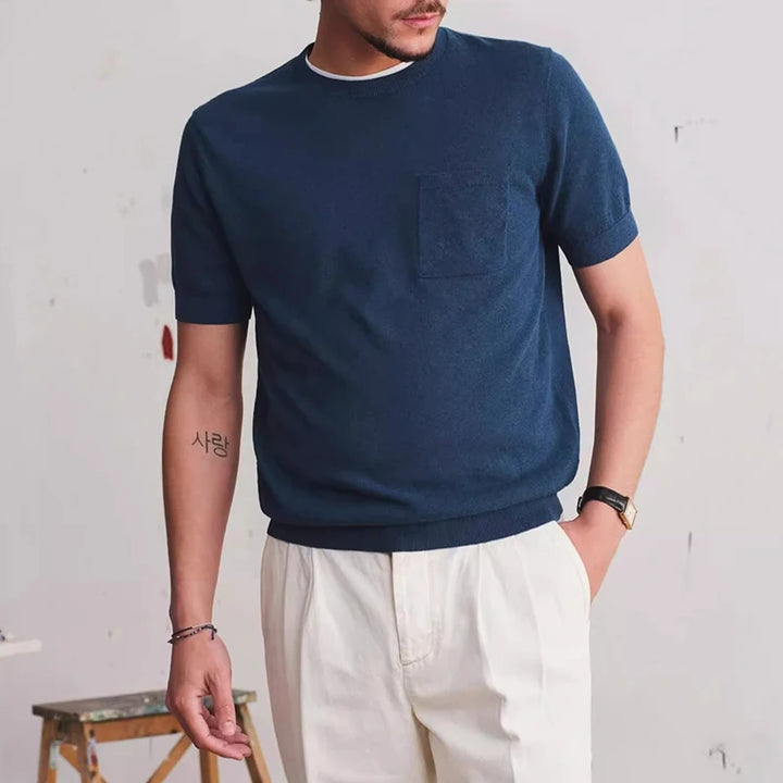 Sold out Stylish Pockets Knit T-shirts Mens Casual Solid Color Slim Fit Knitting Jumper Men Tops Summer Vintage O Neck Short Sleeve Tees 73.46