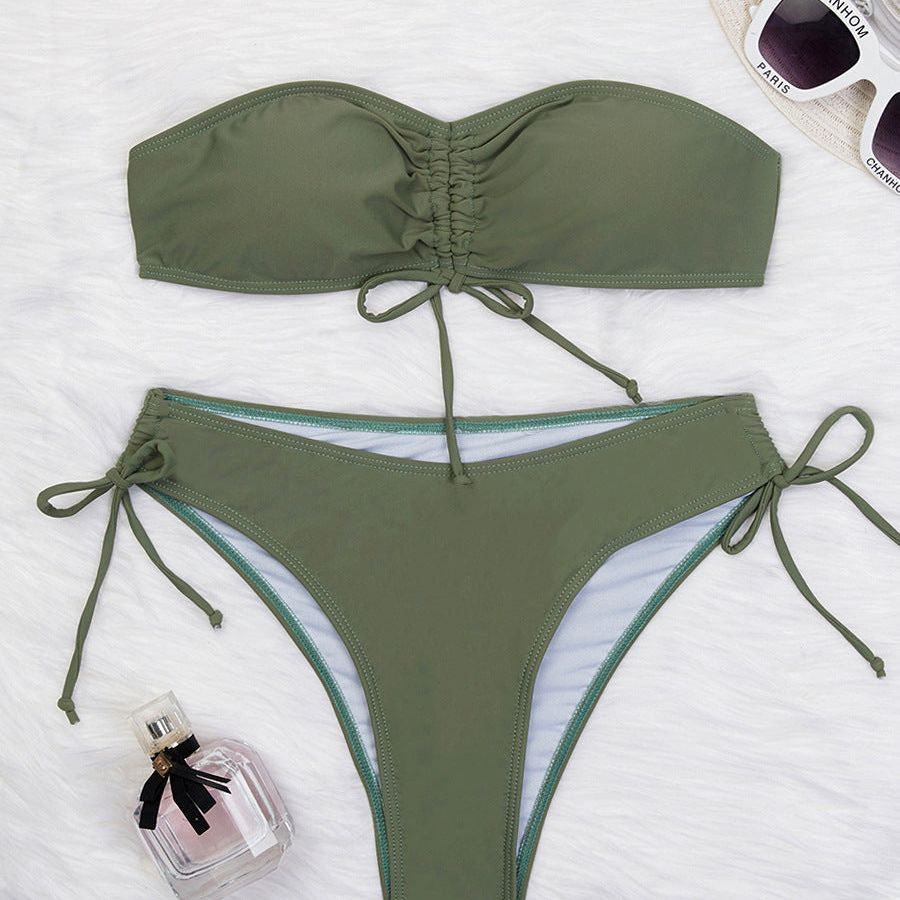 Drawstring Design Tube Bikini Summer Solid Color Sexy Swimsuit For Beach Party Womens Clothing