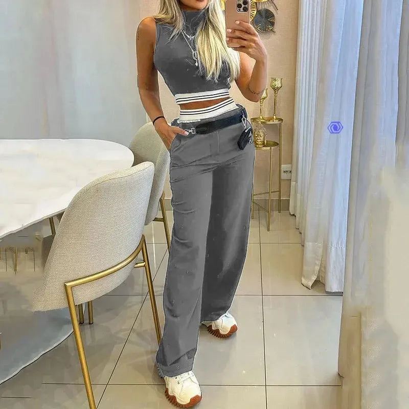 Women Two Piece Set Summer Stylish Round Neck Sleeveless Slim Tank Top Loose Wide Legs No Belt Pants Sets Streetwear